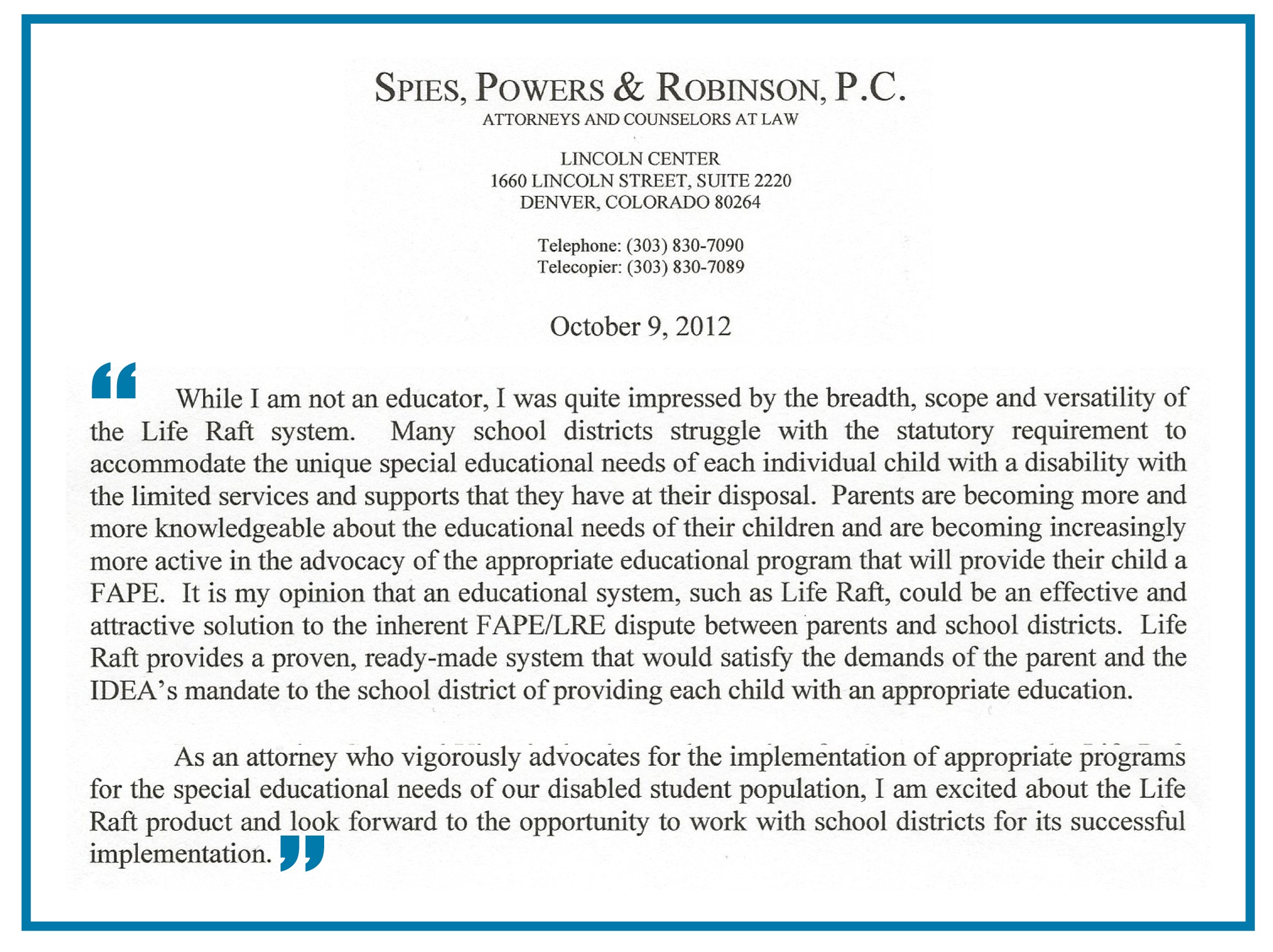 Jack D. Robinson, one of Colorado’s most distinguished and successful attorneys in the field of autism advocacy, thoroughly reviewed the LifeRaft system. He validated the system itself, as well as the value it brings to parents and schools. He underscored other parts of its key strengths – namely, the solutions it offers toward the fulfillment of Federal mandates and the solutions it provides for growing disputes regarding a free, appropriate public education (FAPE) and debates surrounding a least restrictive environment (LRE). These are two particularly contentious matters in the world of special education, especially for children with autism. For parents of individuals on the autism spectrum, attaining services becomes easier when they know exactly what those services should look like. LifeRaft cuts through such ambiguity and provides a clear, definitive and powerful plan of action as well as the tools, materials and means by which to implement that plan.